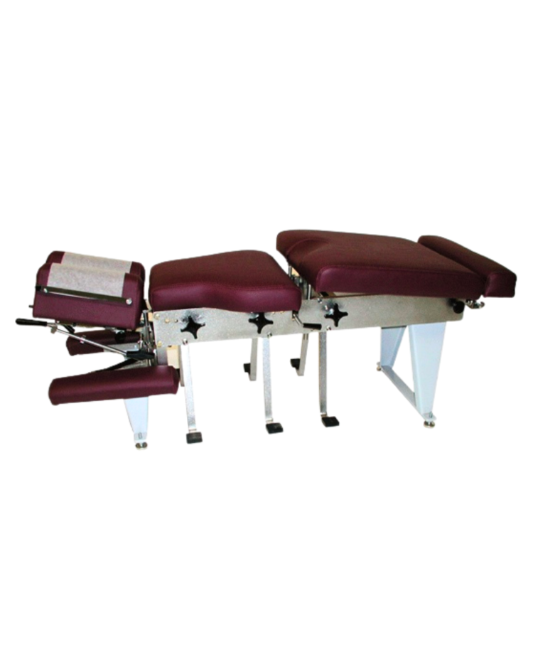 The Astro Stationary model is available with optional manual kick or hand cocking drops of the thoracic, lumbar or pelvic sections. Lloyd's kick drop system allows easy cocking of the cushion, no matter the size of the patient, and assures years of problem-free performance. An adjustable elevated ankle rest is also optional.Lloyd Astro Stationary model comes standard with a one-piece body, tilting headrest, extendable ankle rest; arm rests and add on paper attachment. The table has pre-machined holes and fixtures that allow conversion to a table with manually operated cocking drops.