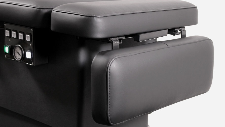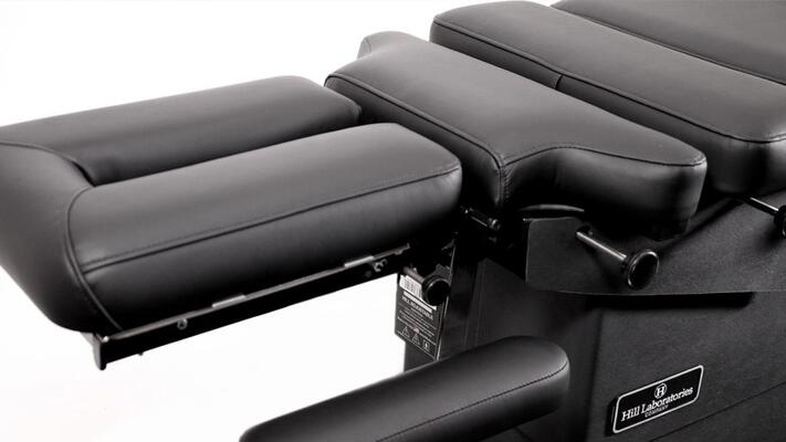The table features a standard Air Thoracic Breakaway section controlled by a pressure pedal at the foot end of the table. The pressure pedal increases or decreases the air-spring pressure in the thoracic / lumbar sections providing a controlled recoil action. The Thoracic Breakaway can also be locked in any position down to 5.5” for treating patients who are pregnant or those with a larger abdominal region.