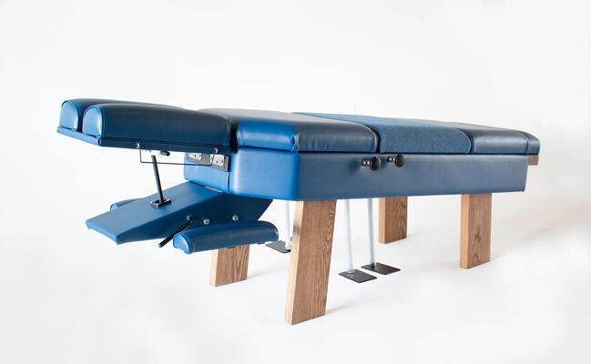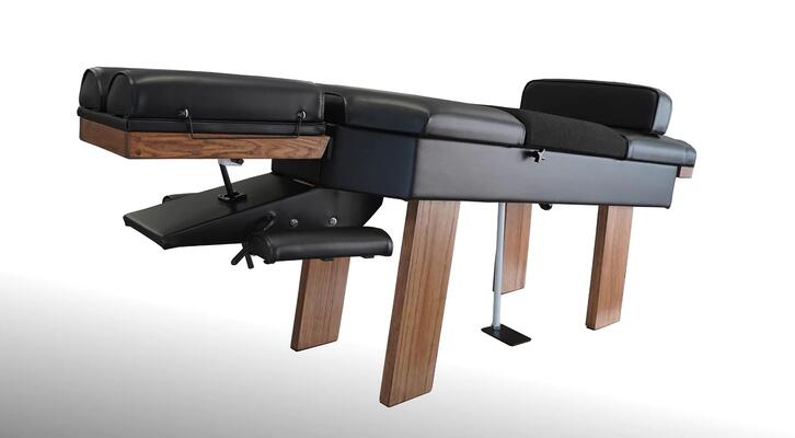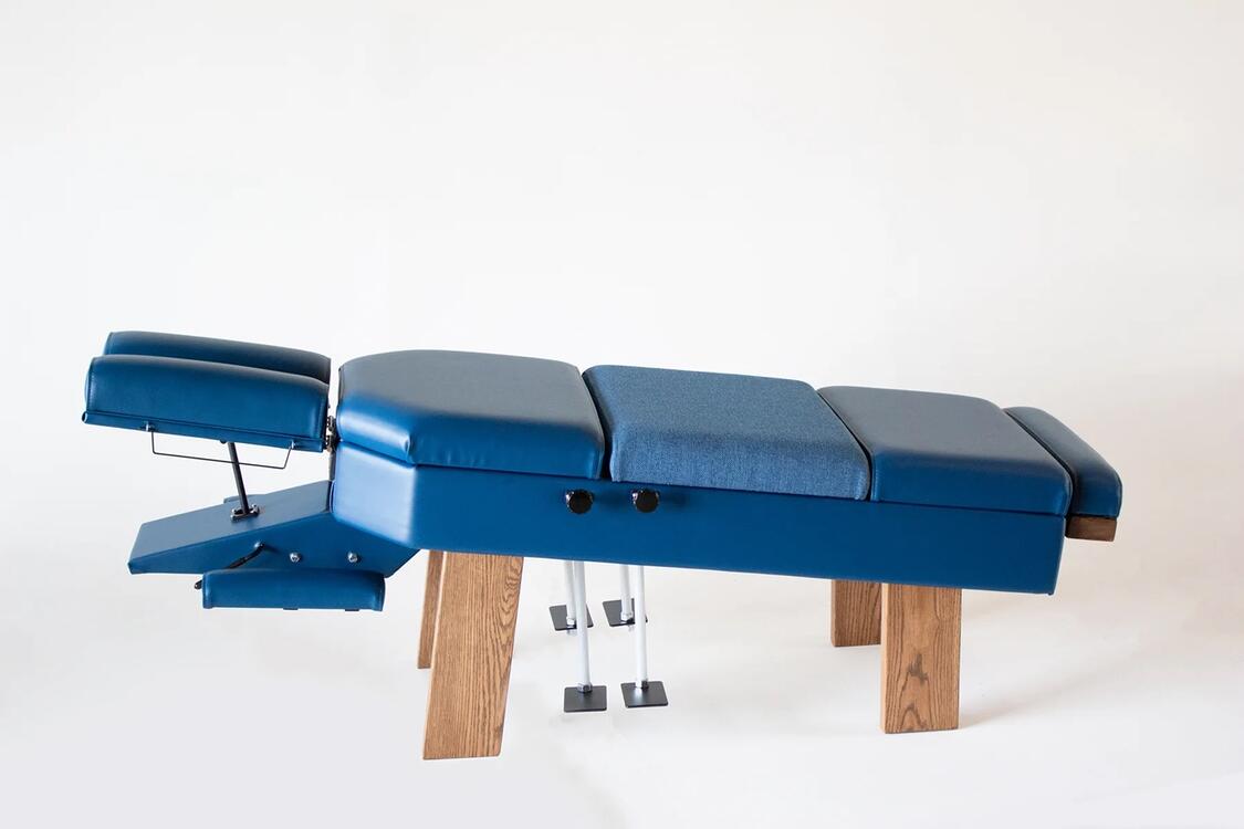 Customize to fit any décor: Our Incline table is available in two vinyl choices that feature a cloth lumbo/pelvic cushion to prevent patients sliding down the incline. If you are interested in other color choices, please contact us for the possibility of custom color combinations. Our drop table cushions use medical grade vinyl that is easy to disinfect and can easily handle steady office use. Likewise, our wooden legs provide a solid base for all your adjusting needs that will last for years and are available in four different woodwork color choices. The working weight of our Prestige Incline Drop Table is 750lbs (340kg).